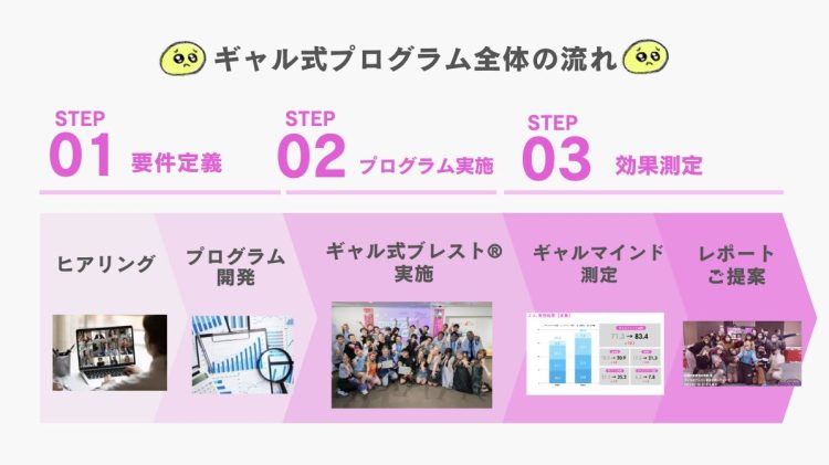 参加者がギャルマインドを活用し、発想力の強化・柔軟性の向上・スピードアップすることを目指して、CGOドットコムでは、本プログラムの企画・課題設計・実施・効果測定・レポーティングに至るまで一貫して担当しました。