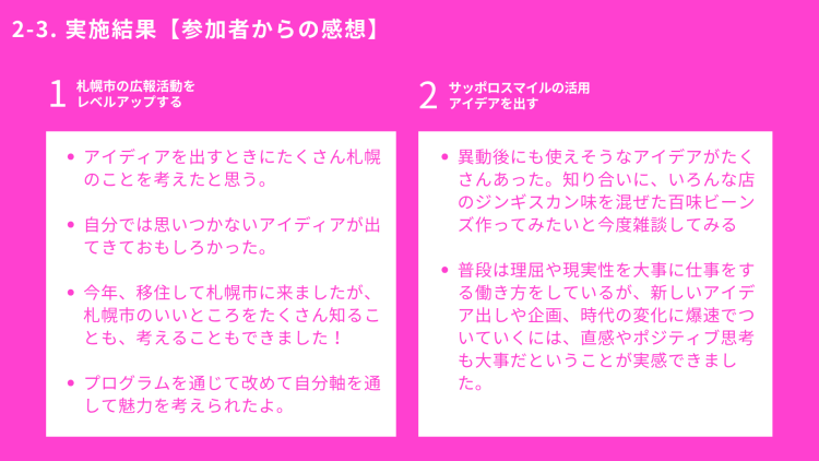「今年、移住して札幌市に来ましたが、札幌市のいいところをたくさん知ることも、考えることもできました!」