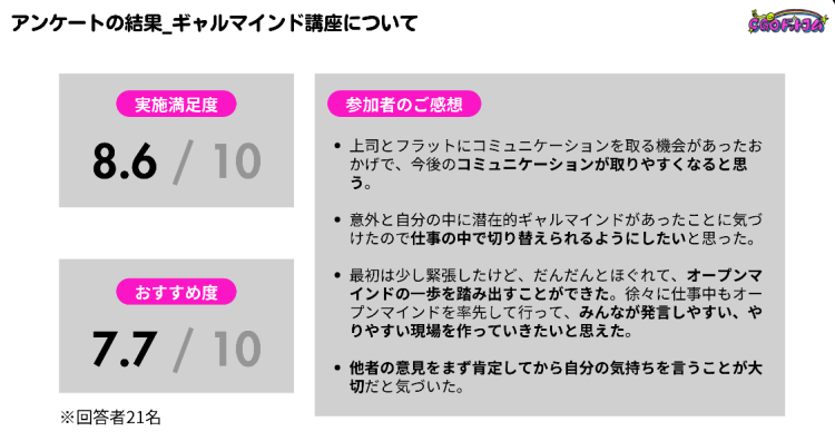 今回ギャルマインド講座では、自発性と他者受容の力を向上する重要性について理解を深め、オープンマインドで年齢や肩書きを問わないフラットなコミュニケーションを促進できました。その結果、何でも話せる雰囲気を醸成し、「チーム意識」を持って関わり合うための基盤づくりができました。