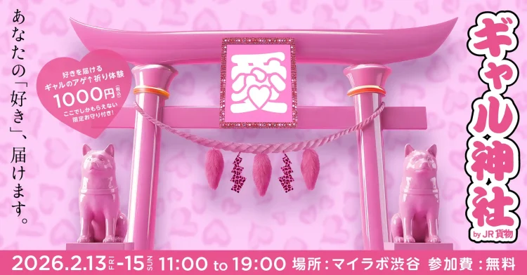 会場となるマイラボ渋谷には、ピンクの鳥居とデコミラーを設置したフォトスポット「ギャル神社本 殿」、恋や推し、自分自身へのエールを後押しする「愛のアゲ⤴みくじ」(無料)、そして、ギャル巫女が想いをまっすぐ受け止め祈りに変える「好きを届けるアゲ⤴祈り体験」(1,000円・お守り付)を用意。現代の若者が自分の気持ちと向き合い、それを”誰かに届ける”体験を、リアルな街の中にデザインします。