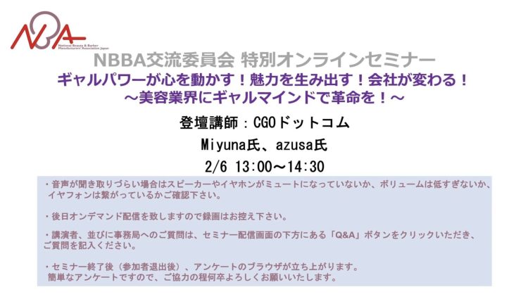 登壇・出演情報 2026/02/16 NBBA(全国理美容製造者協会)の特別オンラインセミナーに、講師としてazusa🌺とMiyuna🌈が登壇いたしました NBBA(全国理美容製造者協会)の特別オンラインセミナーに、講師としてazusa🌺とMiyuna🌈が登壇させていただきました。 ギャルマインドやZ世代の価値観についてお話をさせていただきました。ご参加の皆様、まことにありがとうございました。 ALL