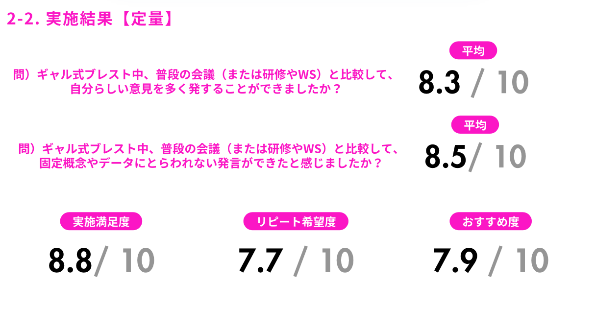 特にCGOメンバーによるギャル式コミュニケーションの手法でリラックスした雰囲気を作り出すことで、柔軟なアイデア出しやポジティブなコミュニケーションを取れた点が高く評価されました。