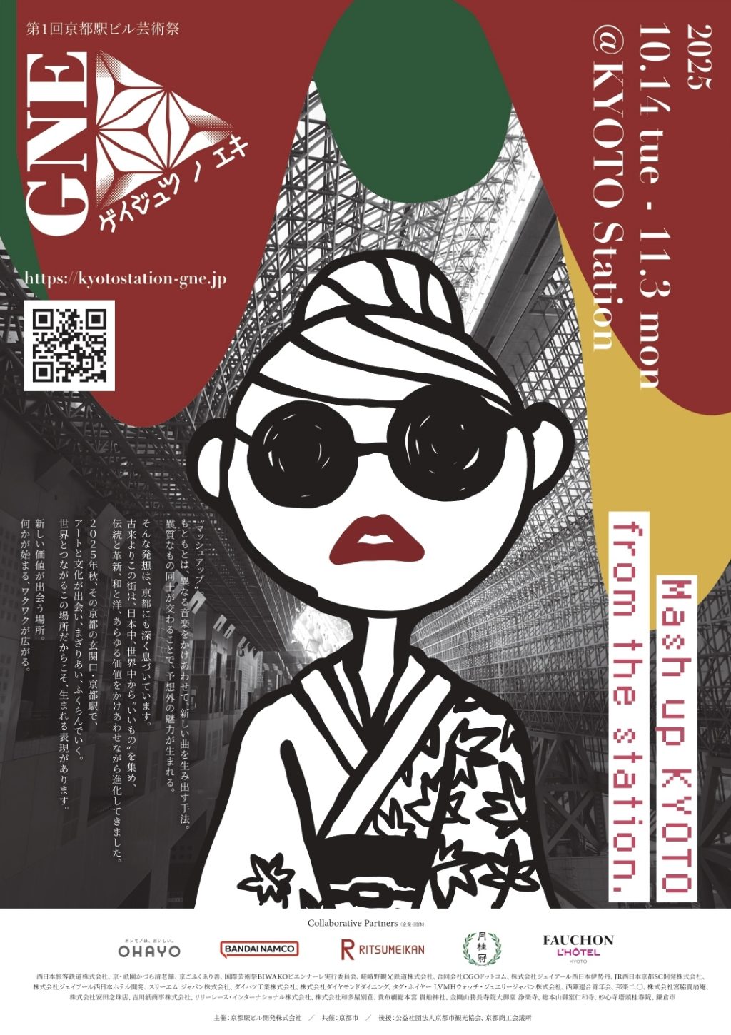 第1回京都駅ビル芸術祭(ゲイジュツ ノ エキ2025/GNE)では、京都駅ビルおよび連携サテライト会場にて22組のアーティストによる伝統×現代の新作“マッシュアップアート”が展示されます。また協賛5社をはじめとする様々な企業・団体等による出店・コラボ商品・特別ステージを開催。ここでしか味わえないイベント限定メニューの食体験、そしてお寺での特別ツアー、ワークショップなど多様な文化体験も展開されます。