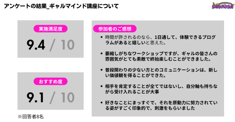「萎縮しがちなワークショップですが、ギャルの皆さんの雰囲気がとても素敵で終始楽しむことができました」