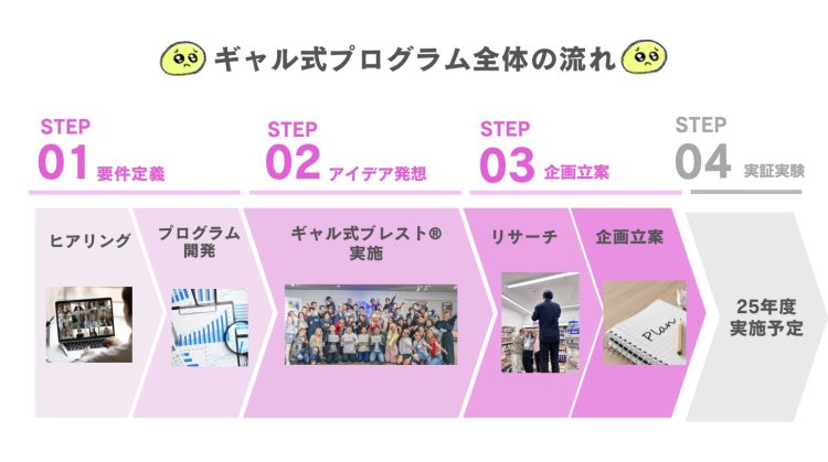 ギャル式ブレスト®︎を起点に、コンビニエンスストアでの体験設計・企画提案までを一気通貫で行 い、「商品を買う」から「体験を楽しむ」へと顧客価値を転換する新しい施策を創出。2025年度には 実証実験フェーズへの展開を予定しています。